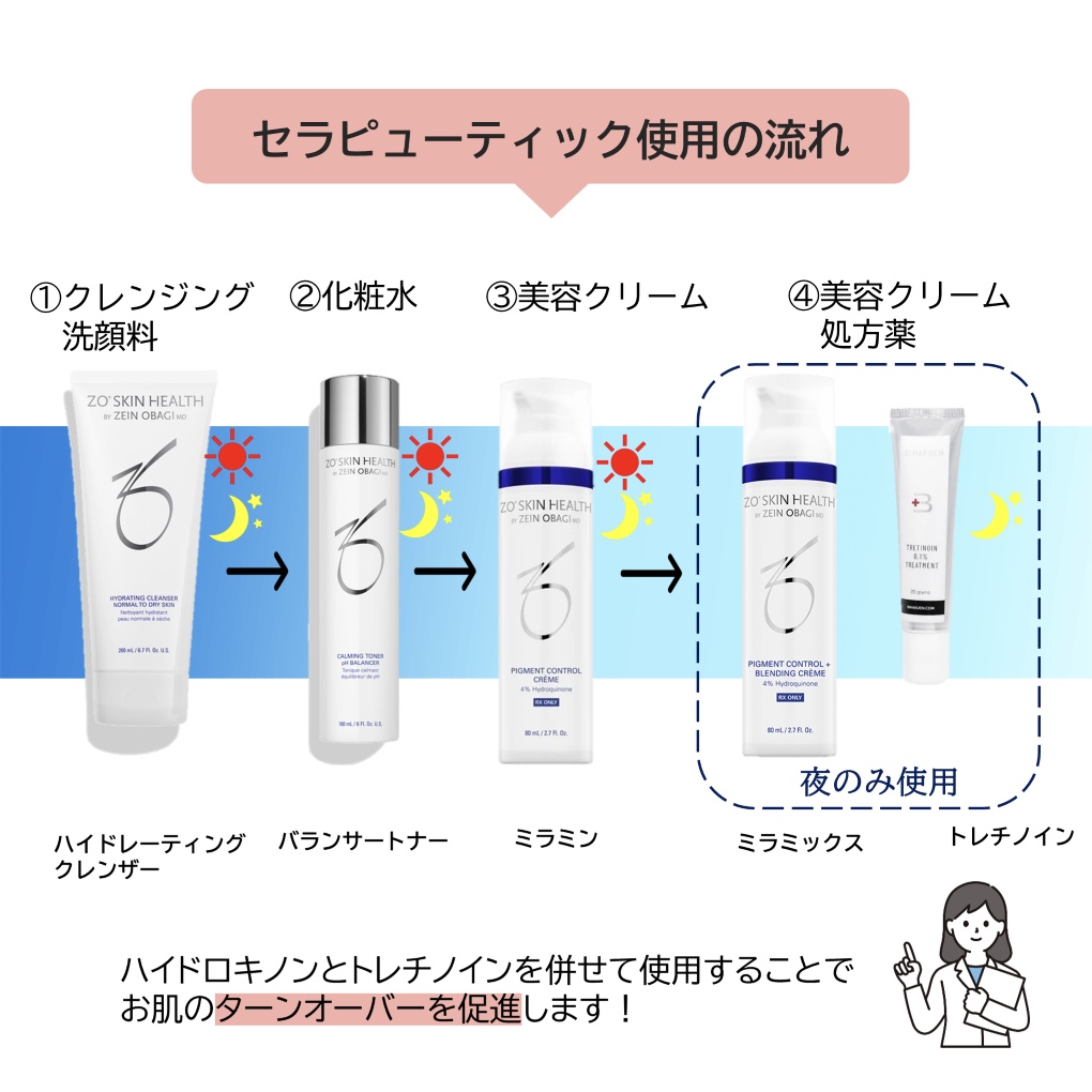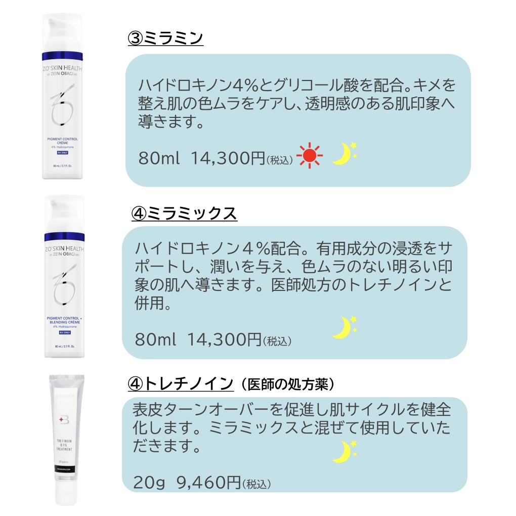 ハイドロキノン、グリコール酸、アスコルビン酸、ビタミンE配合のミラミックスと医師処方のトレチノインクリームを混ぜて使用します。トレチノインクリームの量や使用頻度を絶妙に調整する事によって、患者さまおひとりおひとりのお肌の状態やご要望に合わせたプログラムをご提案しております☺️✨